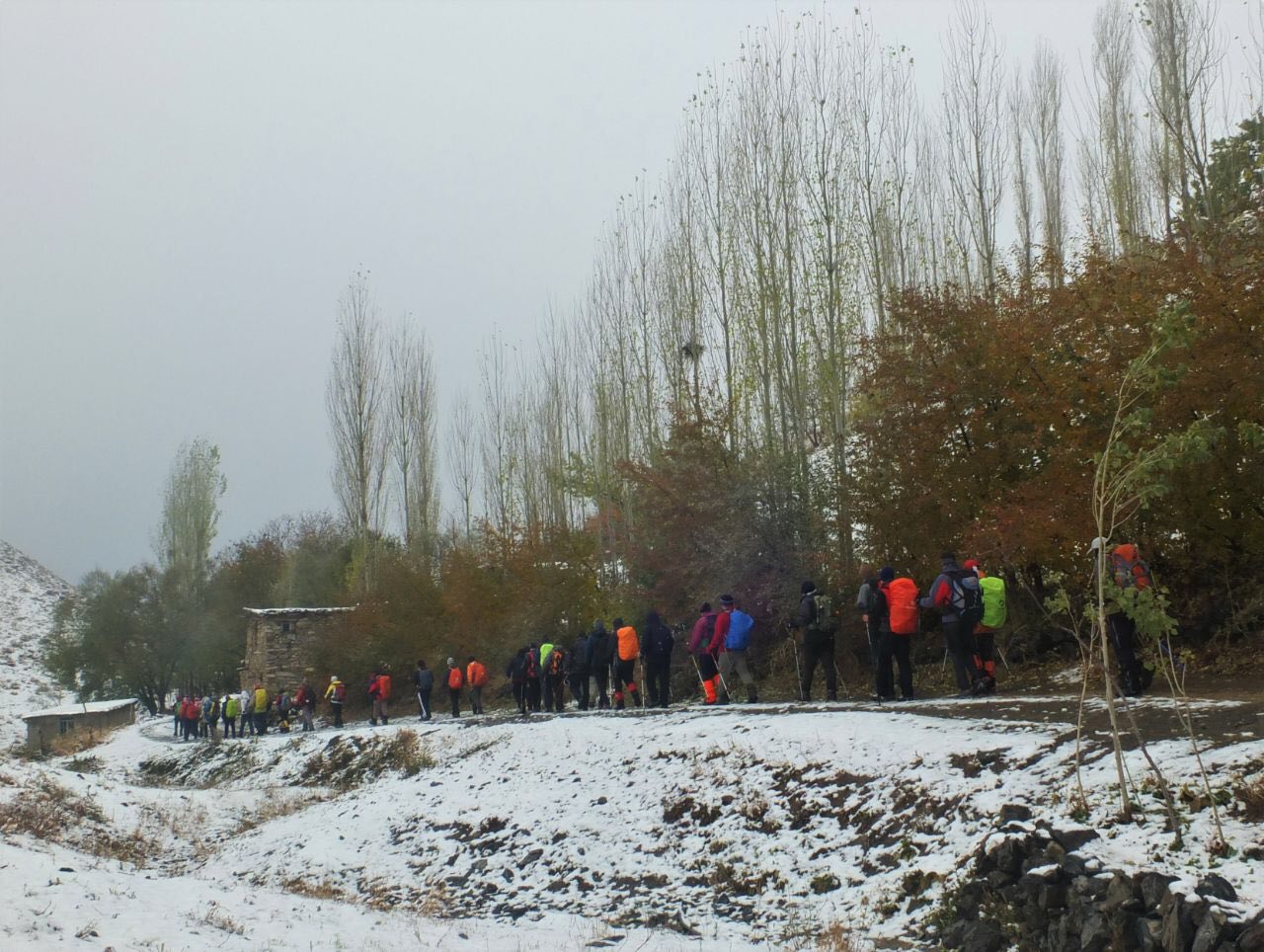 اگرچه پاییز برگریز هنوز رختش را به زمستان نداده اما برف قامت طبیعت منطقه را سفیدپوش کرده و مه بر کل ارتفاعات بالین گسترانیده بود. ساعت ۶:۴۵ تیم از سمت شمال قله (بر روی جاده نظامی با شیب ملایم) راهی مسیر قله شد. پس از طی قسمتی از مسیر، در ساعت ۸:۲۰ تیم برای صرف صبحانه توقف نمود.