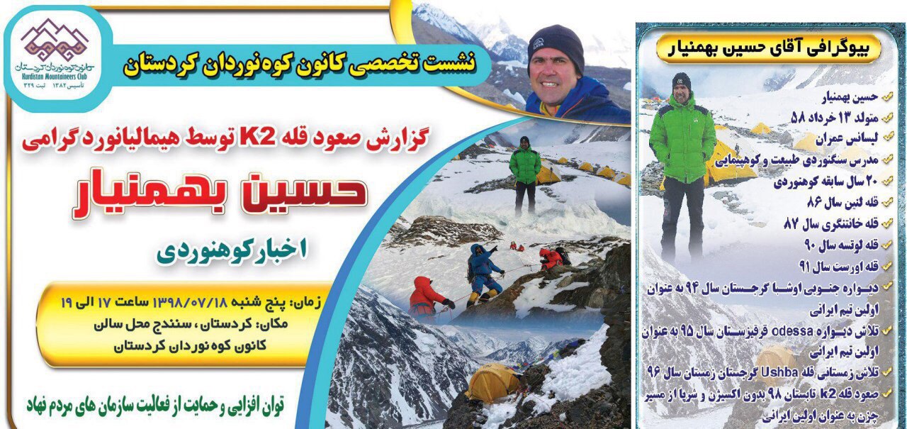 مراسم ” گزارش صعود قله ی K2 توسط حسین بهمنیار” عصر روز پنج شنبه مورخ 18 مهرماه جاری با حضور پشکسوتان کوهنوردی، هیمالیا نوردان، هیات ها، باشگاه ها، گروه ها و تلاشگران عرصه ی ورزش کوهنوردی و محیط زیست در سالن کانون کوه نوردان کردستان برگزار شد. در این مراسم علاوه بر هیمالیانورد فاتح قله ی K2 مهمانان ویژه و نام آشنای عرصه ی کوهنوردی کشور از جمله، پیشکسوت کوهنوردی آقای کیومرث بابازاده، هیمالیانورد مشهدی و دارنده ی نشان پلنگ برفی آقای جواد نوروزی و هیمالیانورد کوردستانی و فاتح اورست آقای حمید دهقان حضور داشتند.